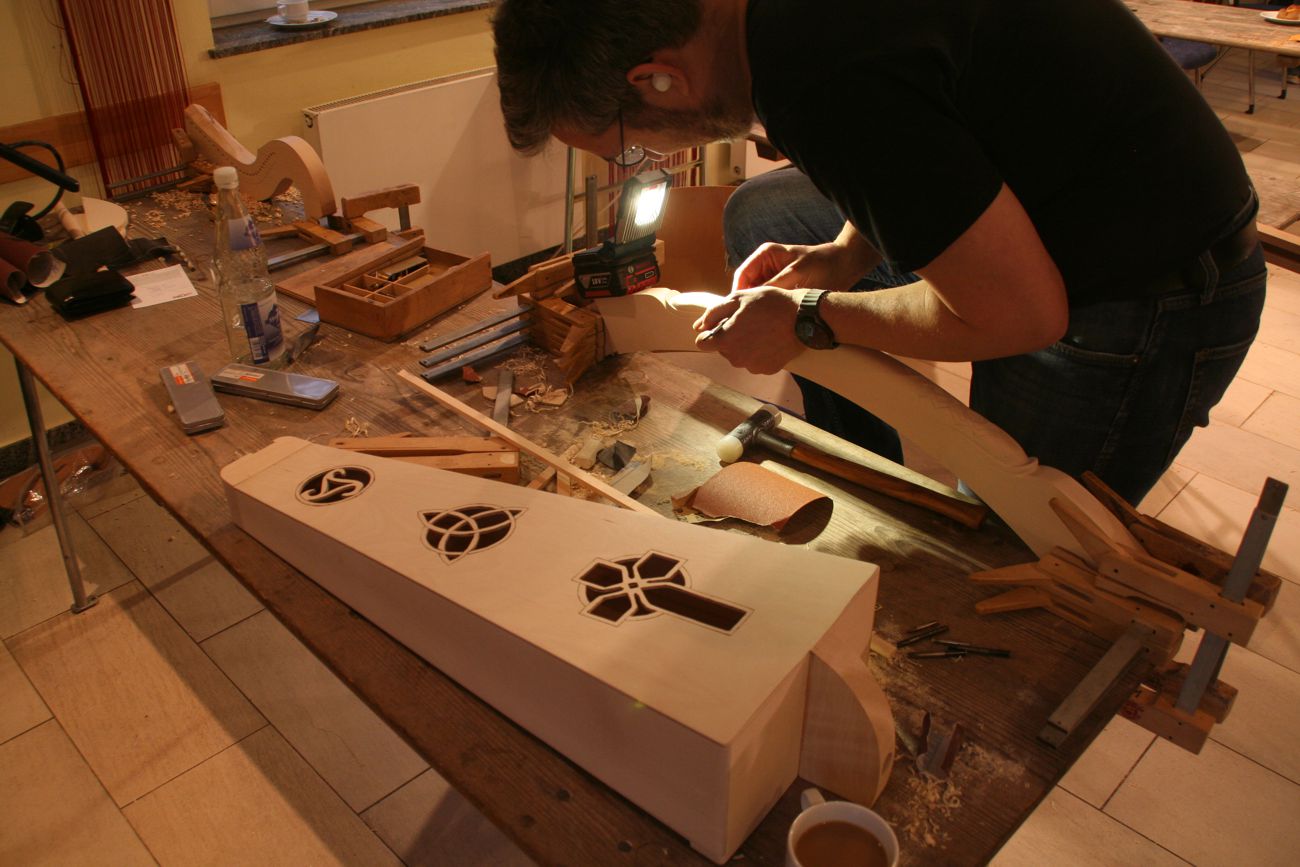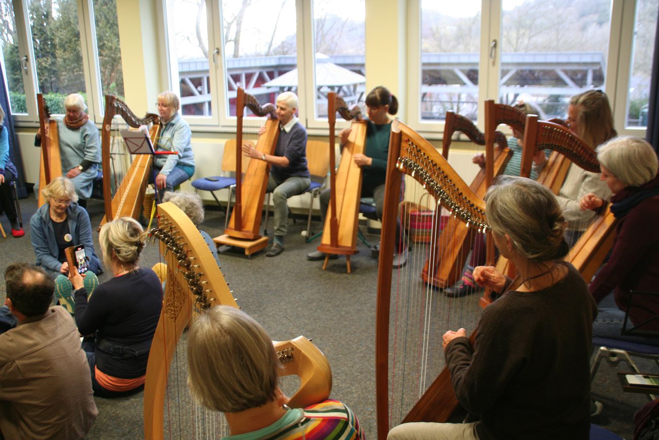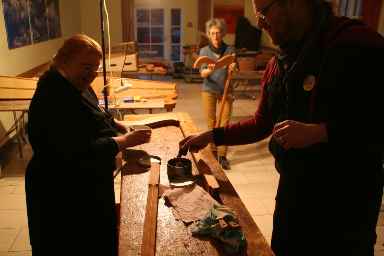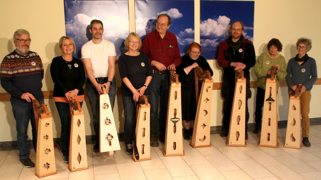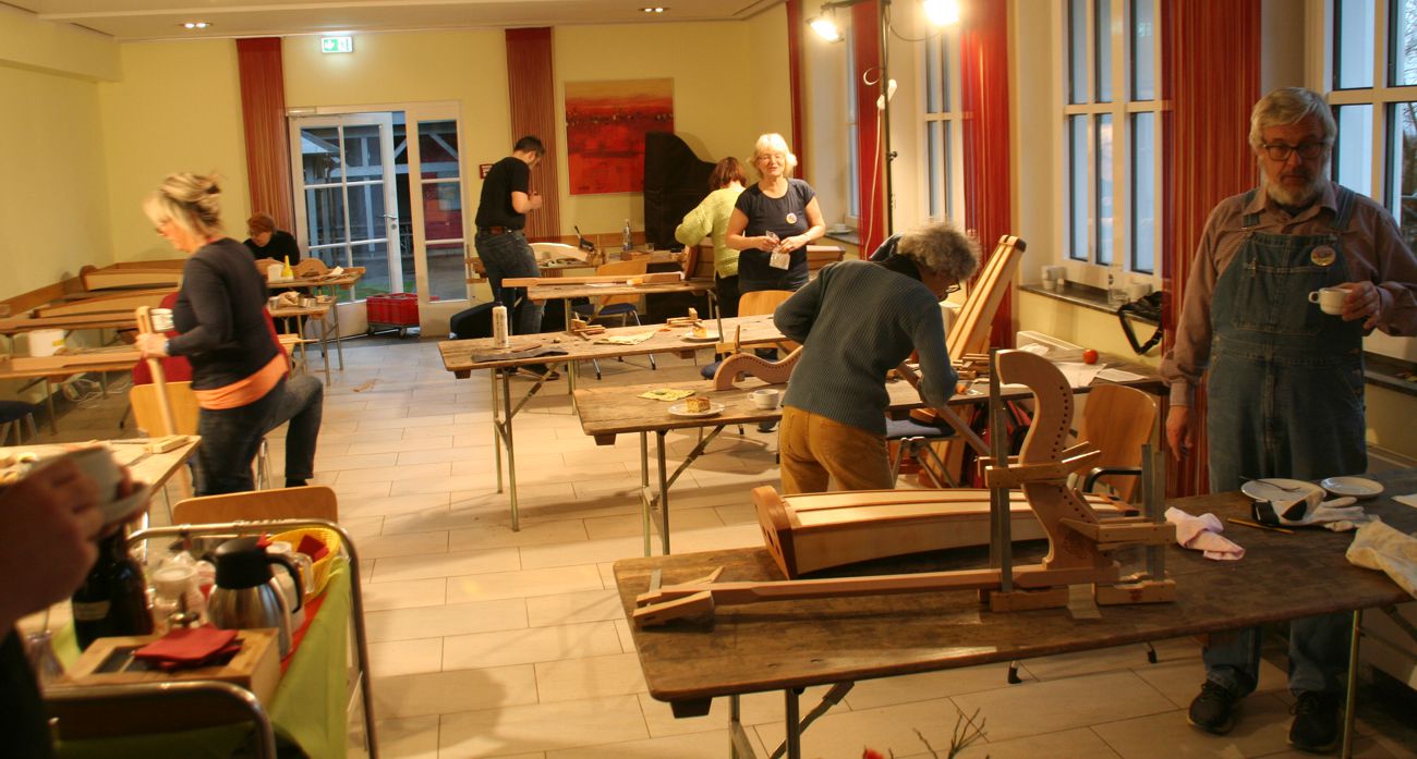 Auch für 2025 organisierte Resia Lehmacher aus Bonn wieder den Bau- und Spielkurs in der Jugendherberge Bad Honnef und es hat wieder unglaublich viel Spaß gemacht. Tagsüber wurde im Baukurs fleißig geraspelt, geschliffen und geschnitzt, während im Harfenspielkurs -unter der Leitung von Tom Daun- die Finger zu glühen begannen.