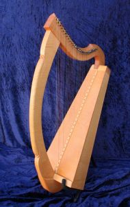 Durch die besondere Form des Korpus am unteren Ende, kann diese Harfe nicht alleine stehen und muß zum Spielen im Schoß gehalten werden.