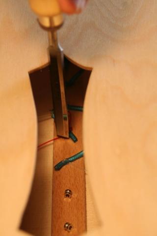Falls man eine Harfe hat, die Surrrr-Geräusche erzeugt, als erstes mal die Knoten anschauen, diese leicht verdrehen und unbedingt zu lange Enden mit einem Stemmeisen abschneiden (siehe letztes Bild).