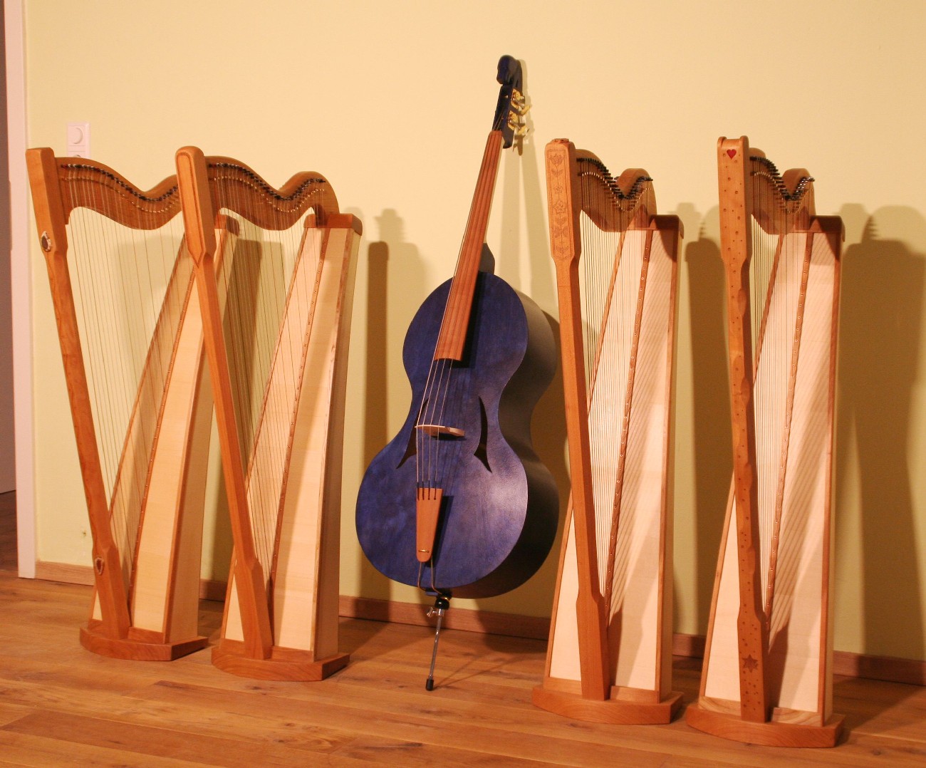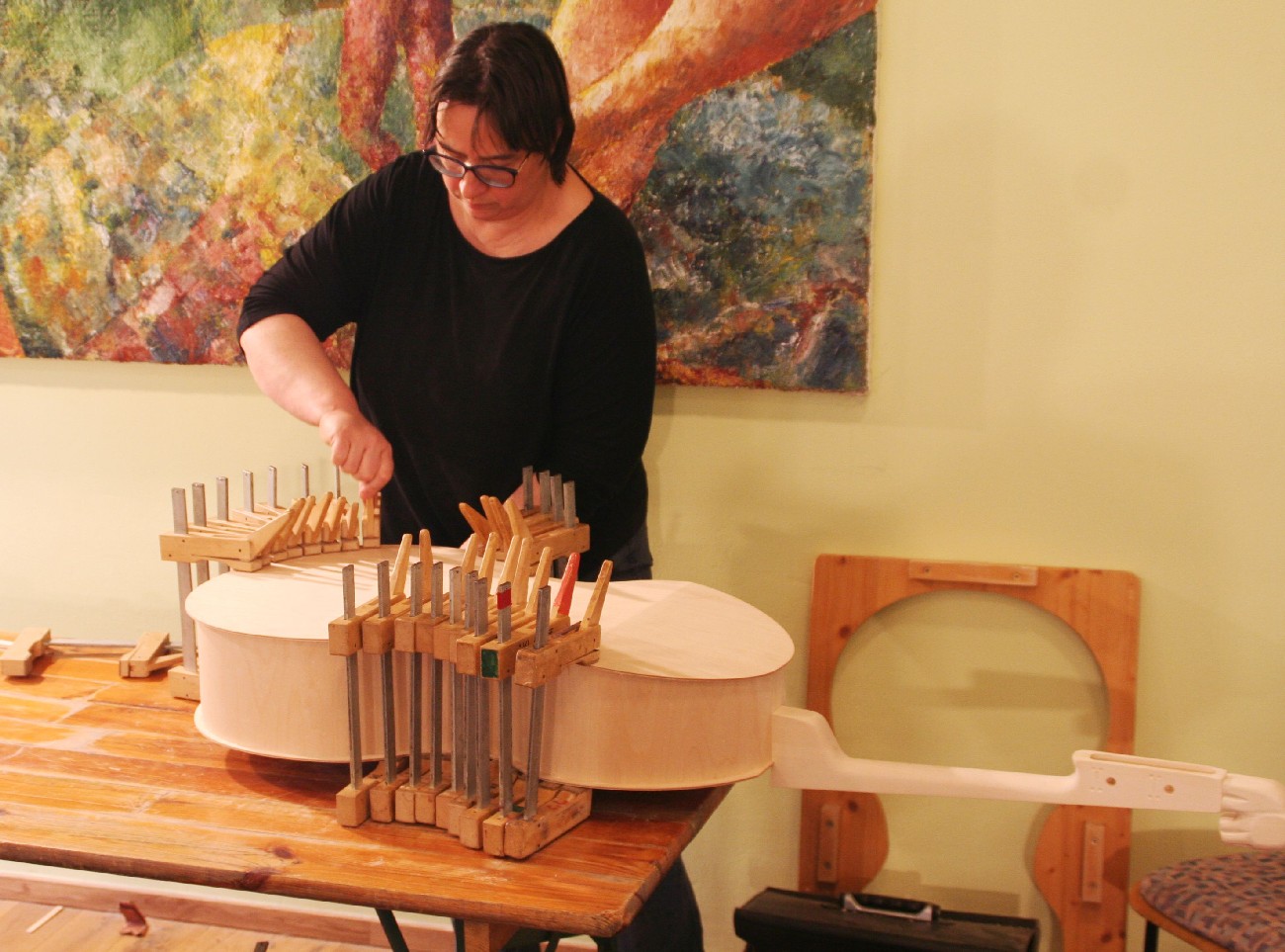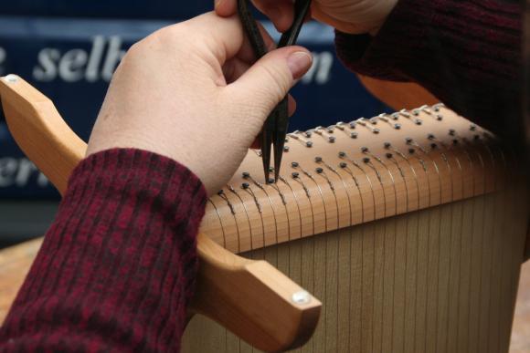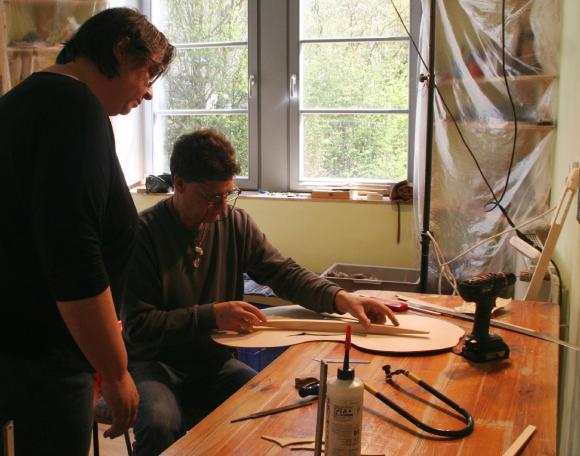 Schon seit einigen Jahren finden in den 2 Räumen der kleinen, privaten Musikschule von Markus Tyroller im Ortsteil Peterstal Instrumentenbaukurse statt. So richteten wir uns auch in diesem Jahr wieder unsere Werkstatt dort ein und verbrachten das Wochenende in entspannter und gleichzeitig sehr kreativer Atmosphäre. Zwischendurch spielte immer mal wieder jemand mit einer Harfe oder auf anderen Instrumenten der Musikschule, so dass die Vorfreude auf das Instrument, an dem jeder gerade baute, noch größer wurde.