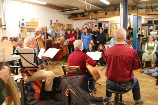 Den Höhepunkt bildete das Abschlussfest in der Klangwerkstatt, wo im Garten, in der alten Gaststube und in der Werkstatt ausgiebig getanzt und gefeiert wurde. Da die Nacht lau und windstill war, wurde der Tanzboden bis weit nach Mitternacht genutzt. Das freut uns ganz besonders, denn fast alle Instrumente, die wir in der Klangwerkstatt bauen, sind Tanzmusikinstrumente.