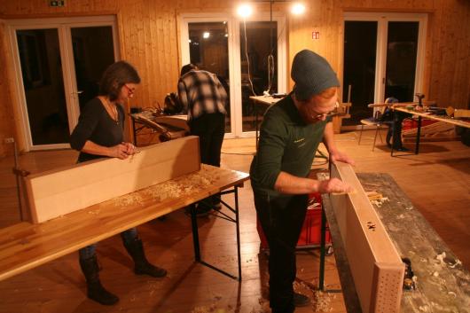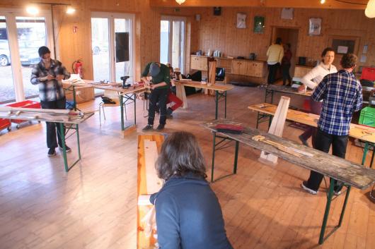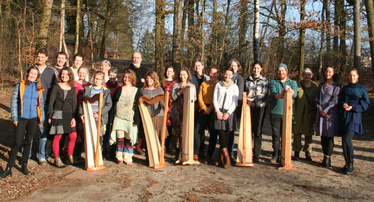 In diesem Jahr fanden beide Kurse nicht mehr im Jugendhof Idingen, sondern im "Camp Adventure" in Vethem bei Walrode statt. Ein wunderschöner Kursort, abgelegen im Wald, umgeben von Seen und großen Bäumen. Die Spielkursgruppen fanden Platz im großen Bettenhaus und im Gemeinschaftshaus, während der Baukurs in einem großen Holzhaus seine Bleibe fand. Mit Holzofen geheizt, war es anfänglich zwar noch etwas kühl, aber dafür entstand gleich eine angenehme Atmosphäre und beim Arbeiten wurde es uns sowieso bald warm. Mit 5 Instrumenten war der Baukurs zwar grenzwertig klein, aber da wir die Abende mit den vielen Harfenspielern verbrachten, waren wir alles in allem eine schöne Gruppe und die Abende reich gefüllt mit Musik, Gesang und Tanz. Vor allem der Abschlussabend war so bunt, wie noch nie. Das hat besonders viel Freude gemacht.