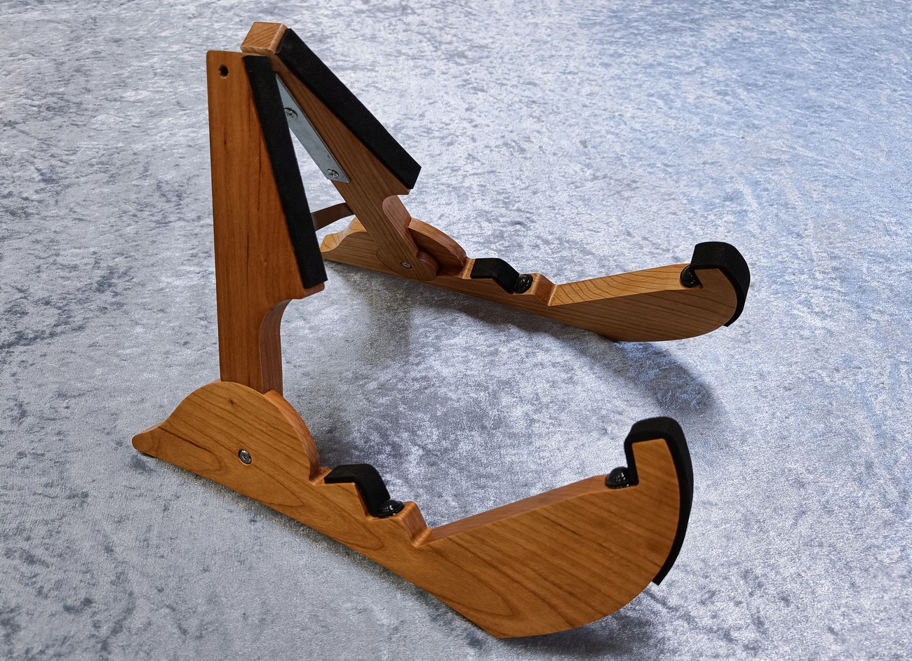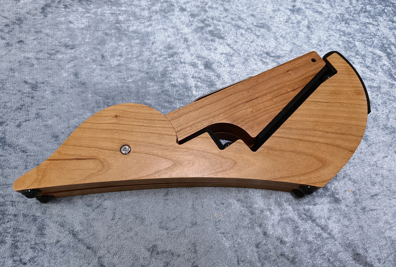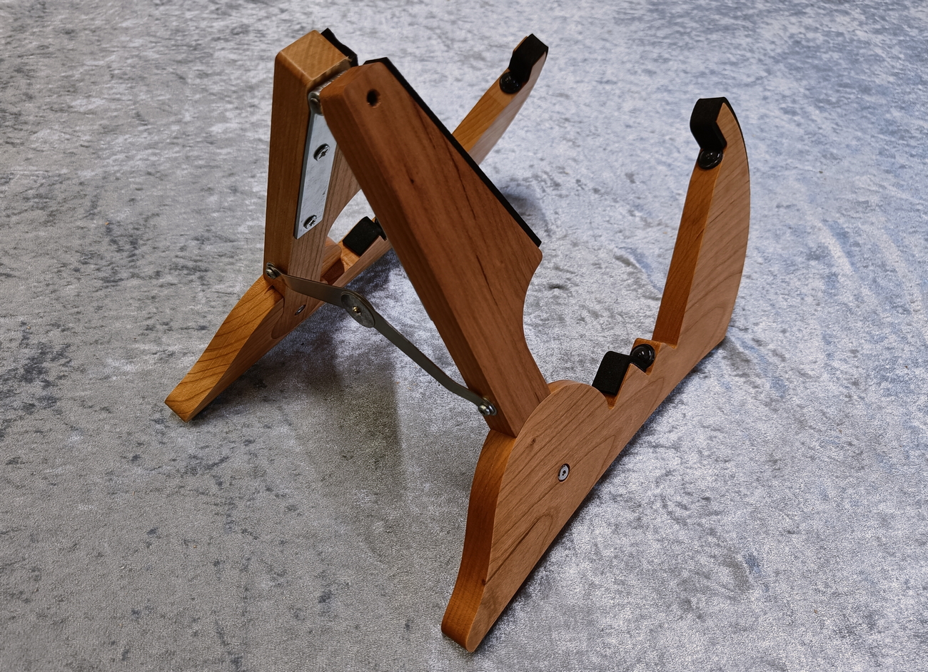 Abhilfe schafft ein kleiner Ständer, den wir in unserer Werkstatt aus Kirschbaumholz selbst bauen und den wir speziell für diese Harfe entwickelt haben.
