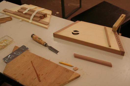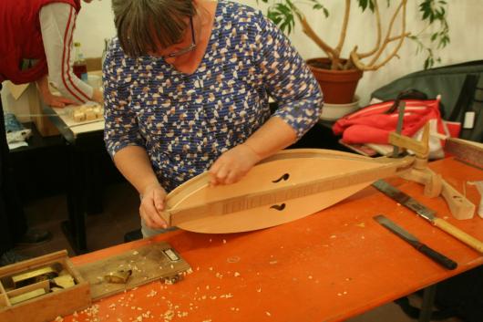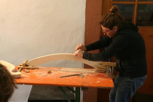 Erstmals waren wir für einen Instrumentenbaukurs auf der Burg Rothenfels am Main und haben die Tage dort sehr genossen. Die Burg hat unglaublich viele verschieden Gruppenräume, schöne Übernachtungszimmer, gutes Essen und vor allem eine große Willkommenskultur, so dass wir uns gleich heimisch und gut aufgehoben fühlten. Unser Baukursraum führte direkt in den grünen Hof der Vorburg, so dass wir bei herrlichem Frühlingswetter auch draußen arbeiten und die Sonne genießen konnten. Erstmals an diesem schönen Kursort hatten sich nur 6 Teilnehmende angemeldet, aber wir hatten dafür um so mehr Spaß im Kurs: Während der Arbeit und an den Abenden wurde gesungen, musiziert, viel erzählt und gelacht.