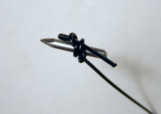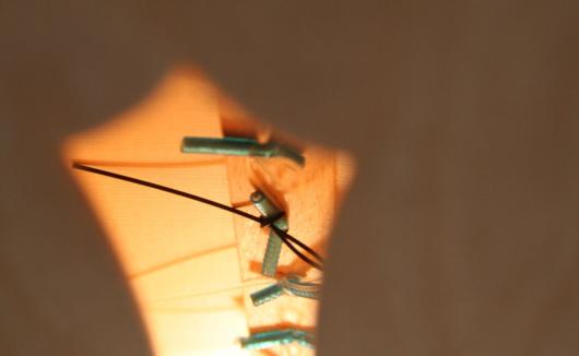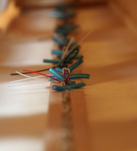 Falls man eine Harfe hat, die Surrrr-Geräusche erzeugt, als erstes mal die Knoten anschauen, diese leicht verdrehen und unbedingt zu lange Enden mit einem Stemmeisen abschneiden (siehe letztes Bild).