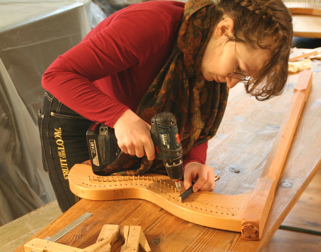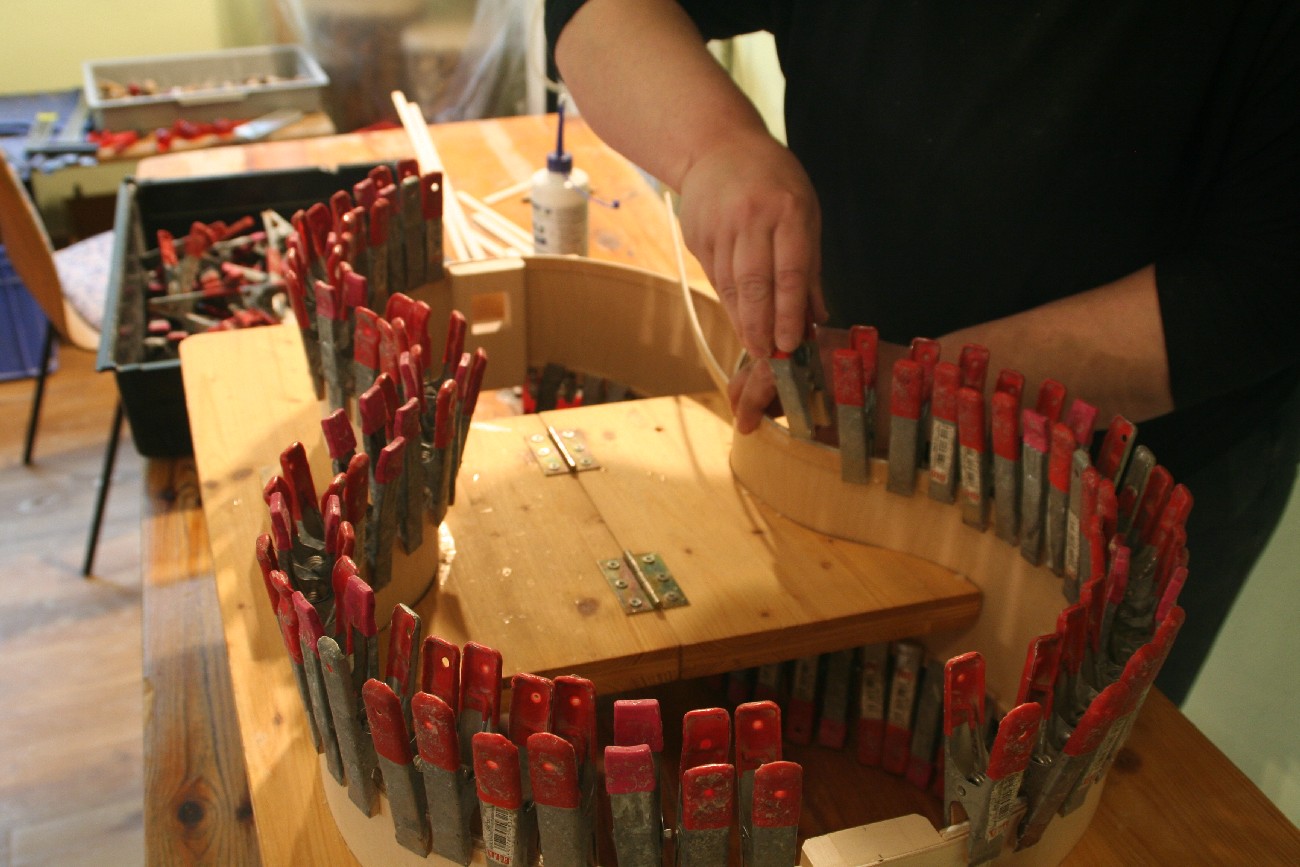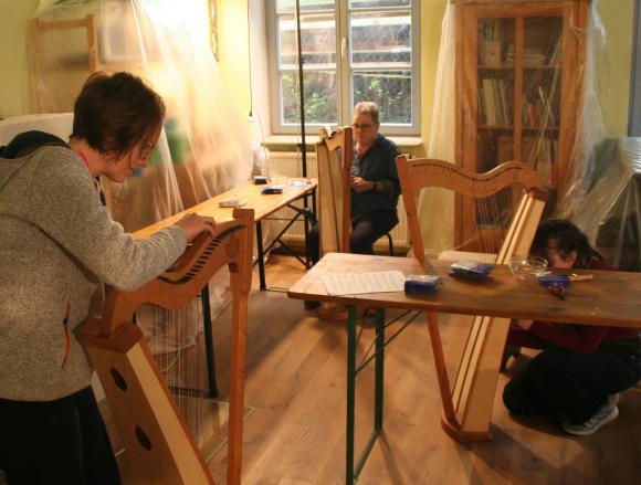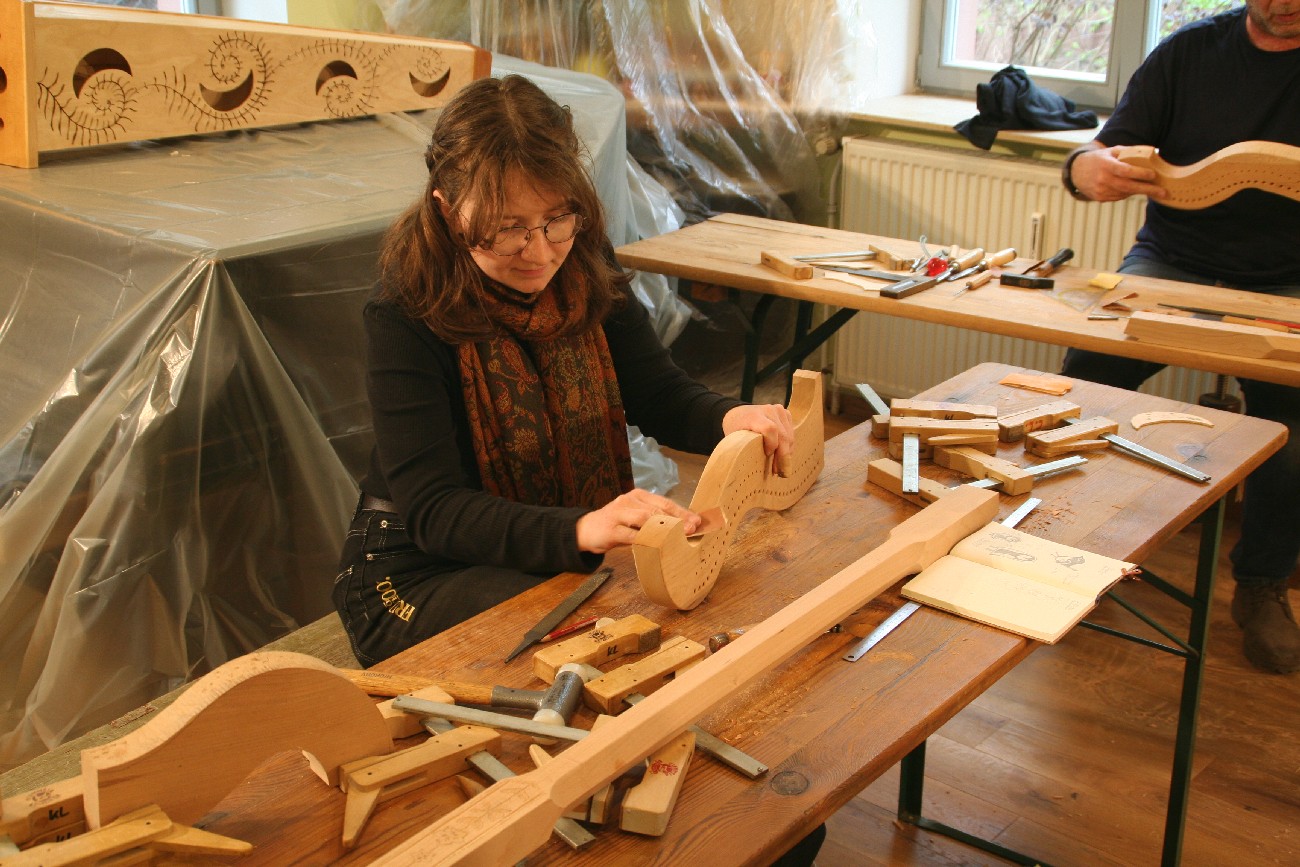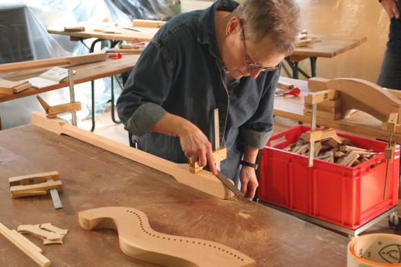 Schon seit einigen Jahren finden in den 2 Räumen der kleinen, privaten Musikschule von Markus Tyroller im Ortsteil Peterstal Instrumentenbaukurse statt. So richteten wir uns auch in diesem Jahr wieder unsere Werkstatt dort ein und verbrachten das Wochenende in entspannter und gleichzeitig sehr kreativer Atmosphäre. Zwischendurch spielte immer mal wieder jemand mit einer Harfe oder auf anderen Instrumenten der Musikschule, so dass die Vorfreude auf das Instrument, an dem jeder gerade baute, noch größer wurde.