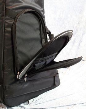 - Besonders hervorzuheben ist bei diesem Model die Notentasche, die, wegen der speziellen Funktion der Reiseharfe, noch einige zusätzliche Aufgaben zu erfüllen hat. So gibt es zwei übereinanderliegende Taschen, in denen sowohl die Noten, als auch Stimmgerät, Stimmschlüssel und Ersatzsaiten, sowie die Wanderbrotzeit oder die Windjacke Platz haben. (Nähere Details dazu weiter unten)