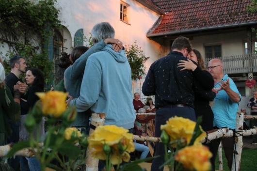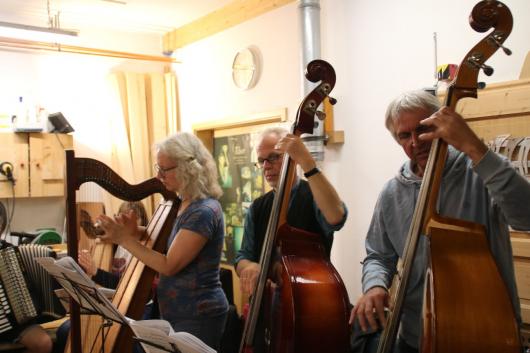 Den Höhepunkt bildete das Abschlussfest in der Klangwerkstatt, wo im Garten, in der alten Gaststube und in der Werkstatt ausgiebig getanzt und gefeiert wurde. Da die Nacht lau und windstill war, wurde der Tanzboden bis weit nach Mitternacht genutzt. Das freut uns ganz besonders, denn fast alle Instrumente, die wir in der Klangwerkstatt bauen, sind Tanzmusikinstrumente.