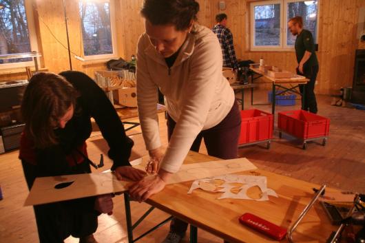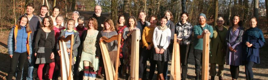 In diesem Jahr fanden beide Kurse nicht mehr im Jugendhof Idingen, sondern im "Camp Adventure" in Vethem bei Walrode statt. Ein wunderschöner Kursort, abgelegen im Wald, umgeben von Seen und großen Bäumen. Die Spielkursgruppen fanden Platz im großen Bettenhaus und im Gemeinschaftshaus, während der Baukurs in einem großen Holzhaus seine Bleibe fand. Mit Holzofen geheizt, war es anfänglich zwar noch etwas kühl, aber dafür entstand gleich eine angenehme Atmosphäre und beim Arbeiten wurde es uns sowieso bald warm. Mit 5 Instrumenten war der Baukurs zwar grenzwertig klein, aber da wir die Abende mit den vielen Harfenspielern verbrachten, waren wir alles in allem eine schöne Gruppe und die Abende reich gefüllt mit Musik, Gesang und Tanz. Vor allem der Abschlussabend war so bunt, wie noch nie. Das hat besonders viel Freude gemacht.